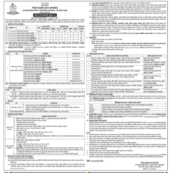 वीरगंज । नेपाल प्रहरीले ठूलो संख्यामा भर्ति खुलाएको छ । नेपाल प्रहरी प्रधान कार्यालयले जनपद प्रहरी समूहतर्फ रिक्त पदपूर्तिका लागि आवेदन मागेको हो ।