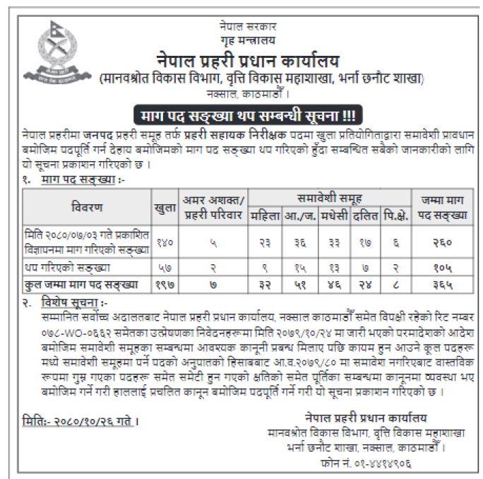 नेपाल प्रहरीलले गत कात्तिक ३ गते प्रकाशित गरेको विज्ञापनमा थन जनशक्ति माग गरेको छ । जसअनुसार प्रहरी सहायक निरीक्षक पदमा १०५ जना थप जनशक्ति माग भएको हो ।