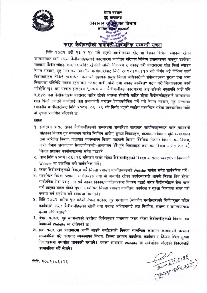 कारागार व्यवस्थापन विभागले आइतबार आफ्नो आधिकारिक वेबसाइटमार्फत फरार रहेका ६ हजार ५१६ कैदीबन्दीको नामावलीसहितको विस्तृत विवरण सार्वजनिक गर्दै उनीहरूको खोजी र नियन्त्रणका लागि देशभरका सबै सरकारी निकायरूलाई सक्रिय हुन निर्देशन सूची सार्वजनिक भएको विभागले जनाएको हो ।